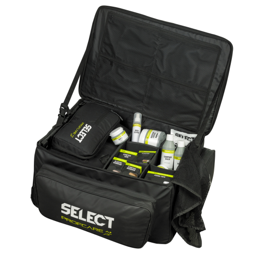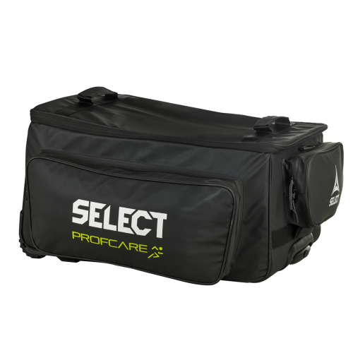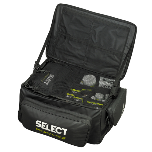 • Особливості: Медична сумка на колесах підійде для використання на полі або в роздягальні будь-якого клубу. Дана модель, що виготовлена з водостійкого поліуретану. Легко вмістить середню або велику медичну сумку з модельного ряду медичних сумок бренду SELECT. Сумка має кілька багатофункціональних кишень, внутрішню сітку, а також жорстку внутрішню стінку з кріпленнями на липучках для індивідуального розміщення всіх необхідних медичних аксесуарів. На передній панелі розміщений логотип бренду SELECT.